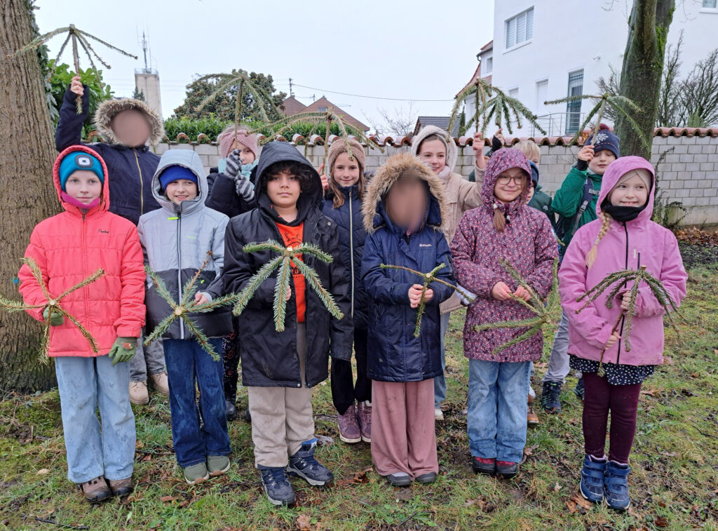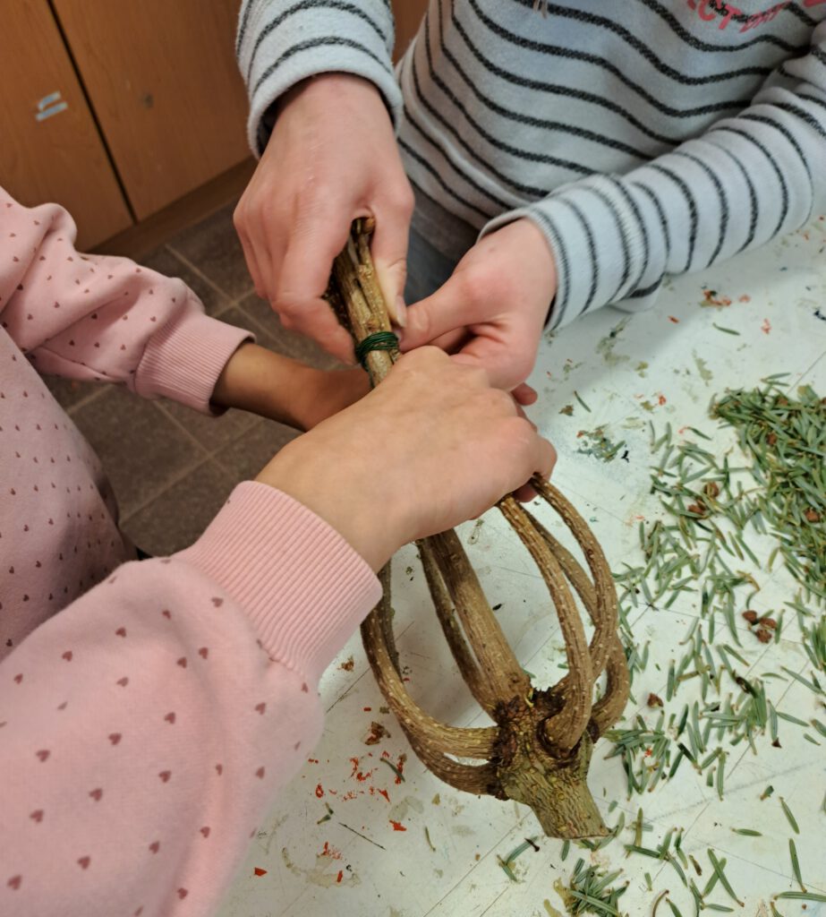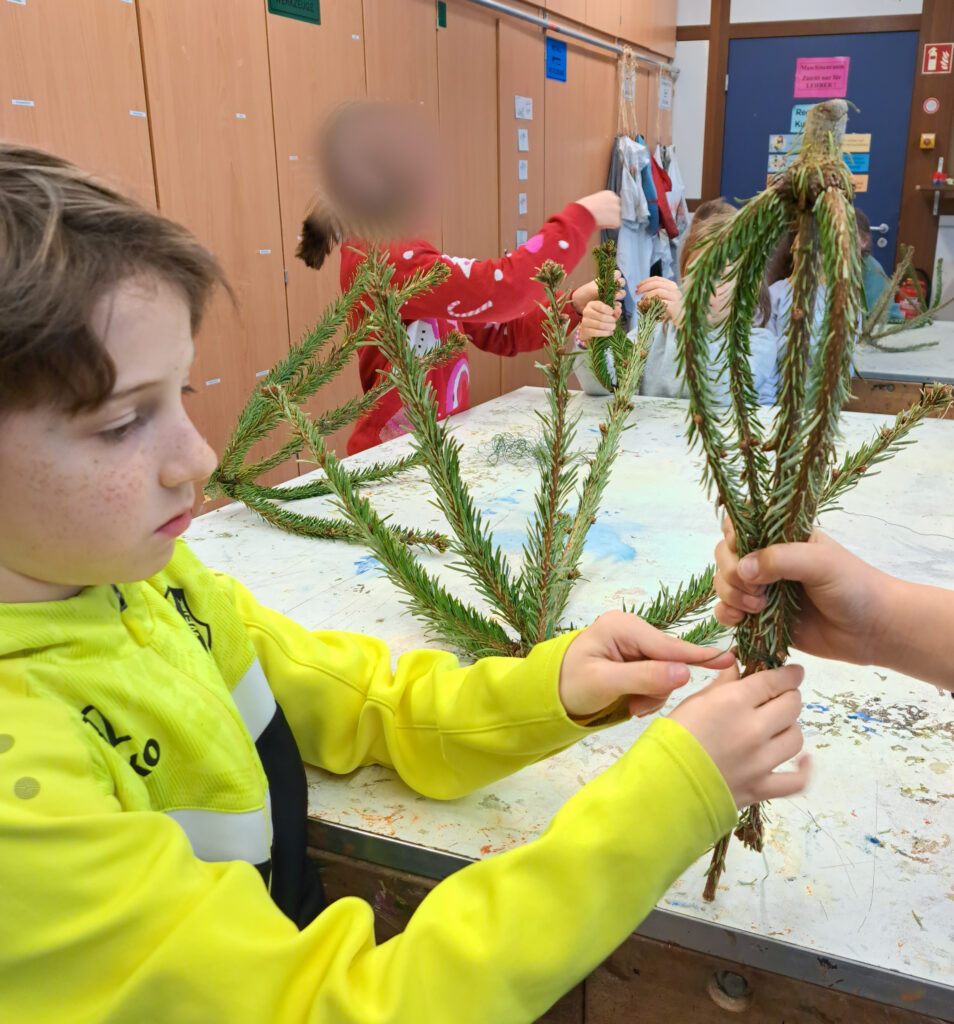 Bei den Tannenbaum-Sammelstellen an der Schule wurde im neuen Jahr fleißig Material für Naturrührbesen gesammelt. Der Rohling wurde von den Kindern geformt und mit Bindedraht fixiert. Diese müssen nun drei Monate trocknen, damit die Form erhalten bleibt.